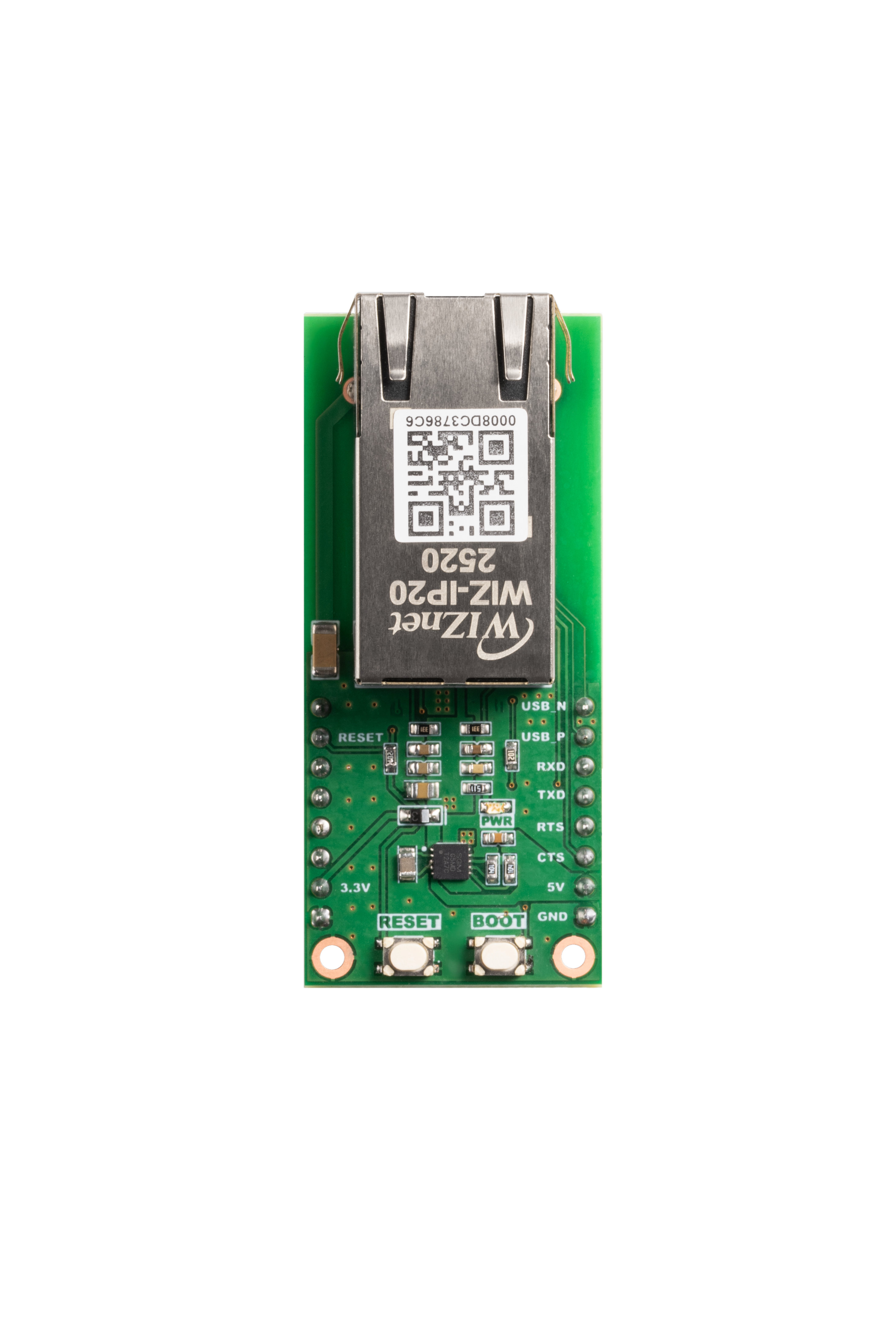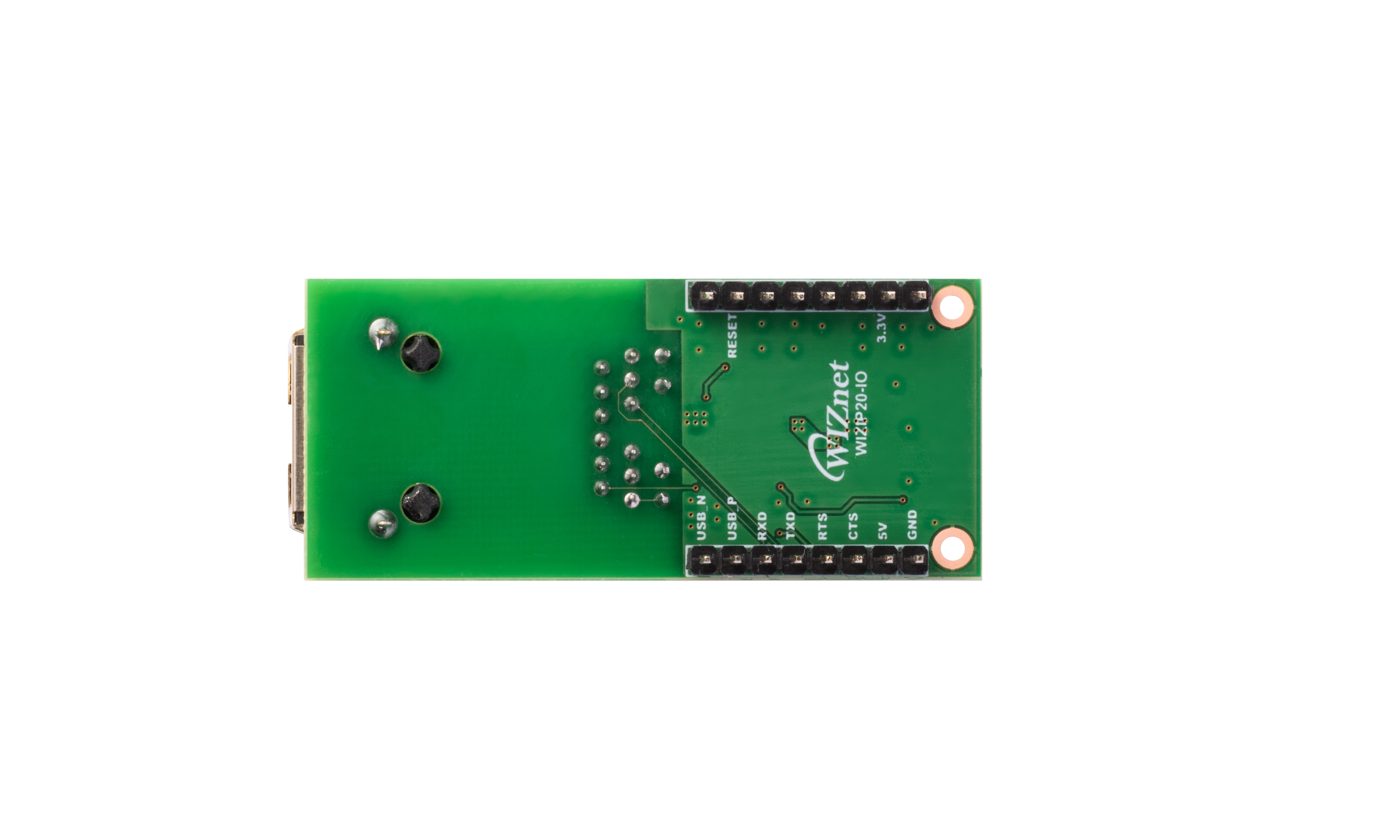 wizip20-io is an interface board for the WIZ-IP20 ioPort Serial-to-Ethernet Mag Jack module, providing easy access to UART, power, and control signals for rapid prototyping and evaluation.