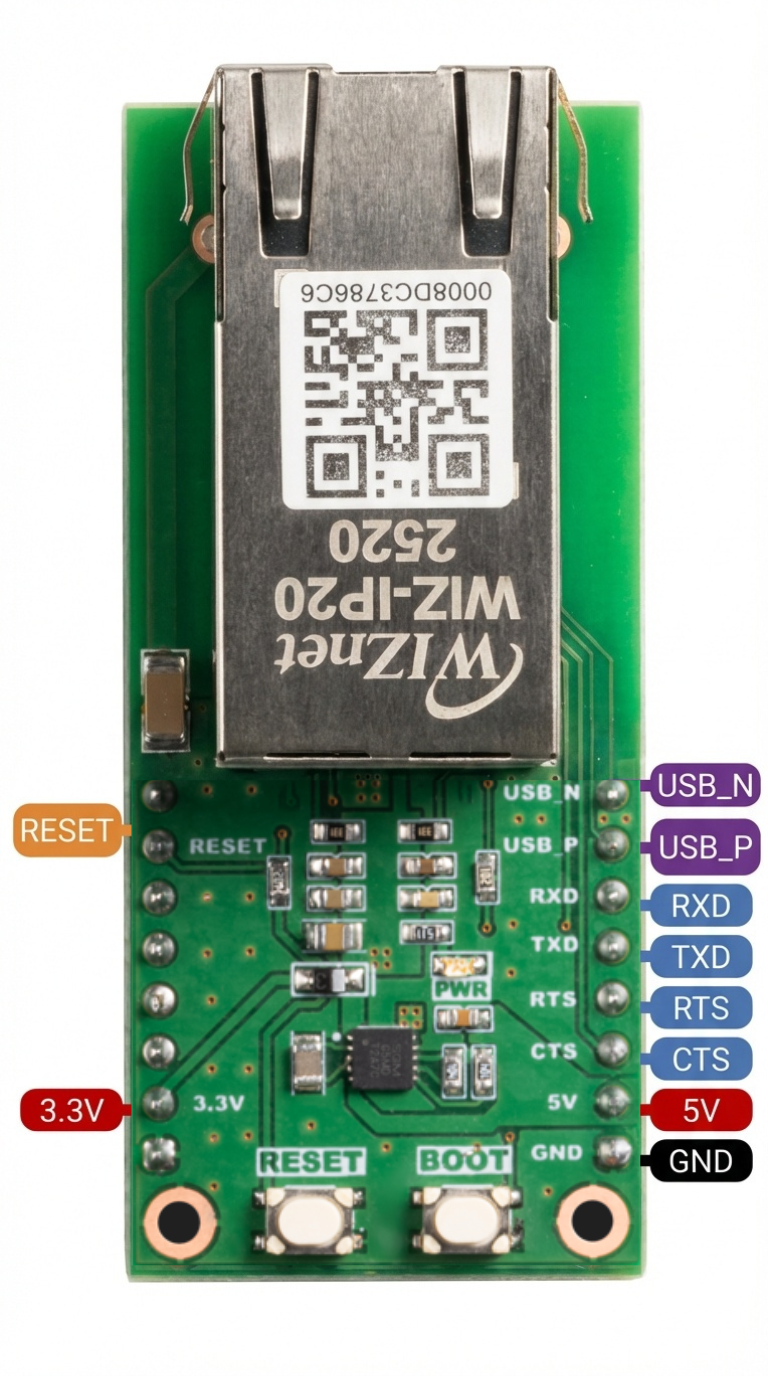 | I | RXD | Data UART RX to WIZ-IP20 (connect to TX of external MCU/device) |