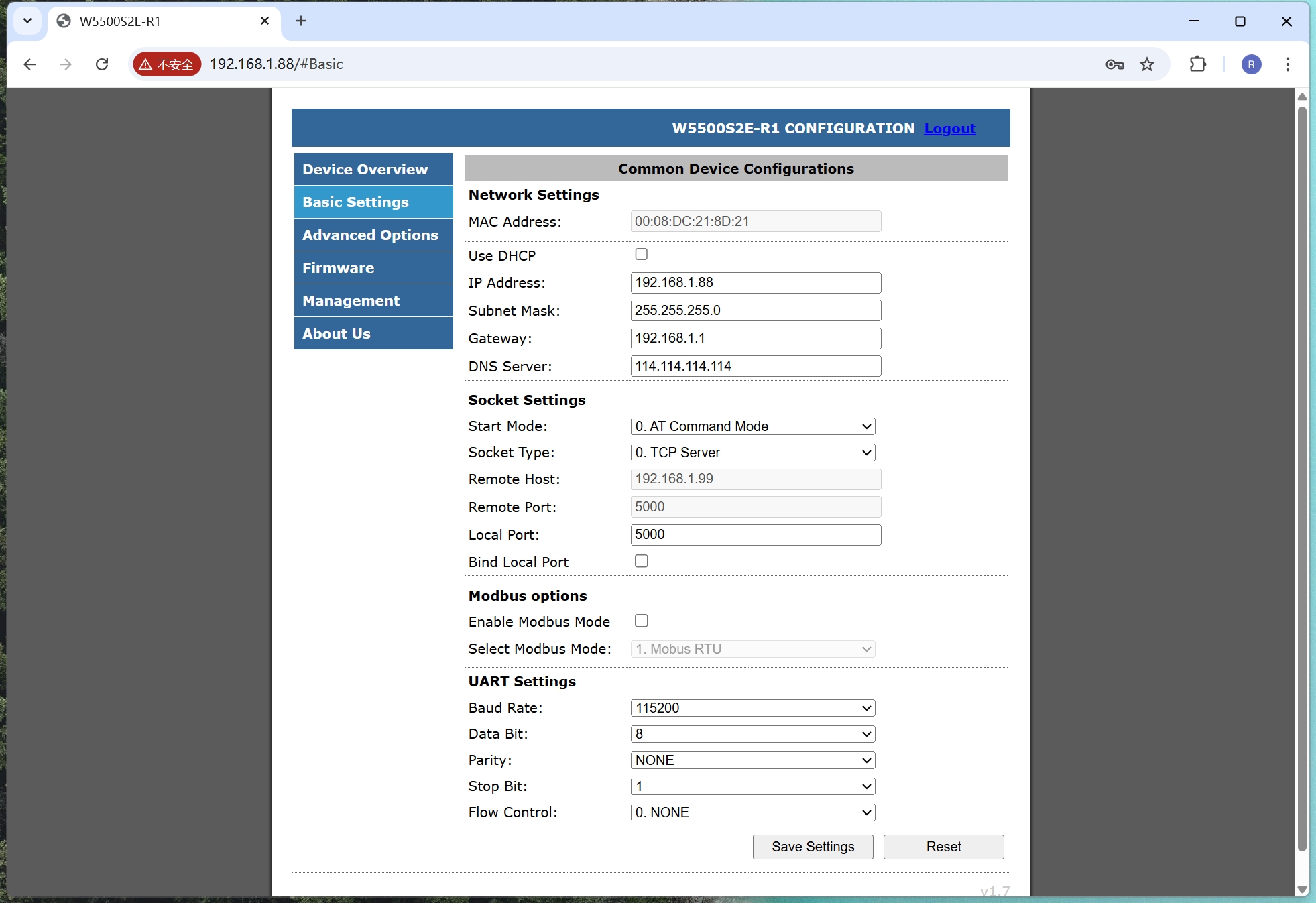As shown in the following figure, it is the WIZ-IP75 basic parameter configuration page,which is divided into following parts for explanation.