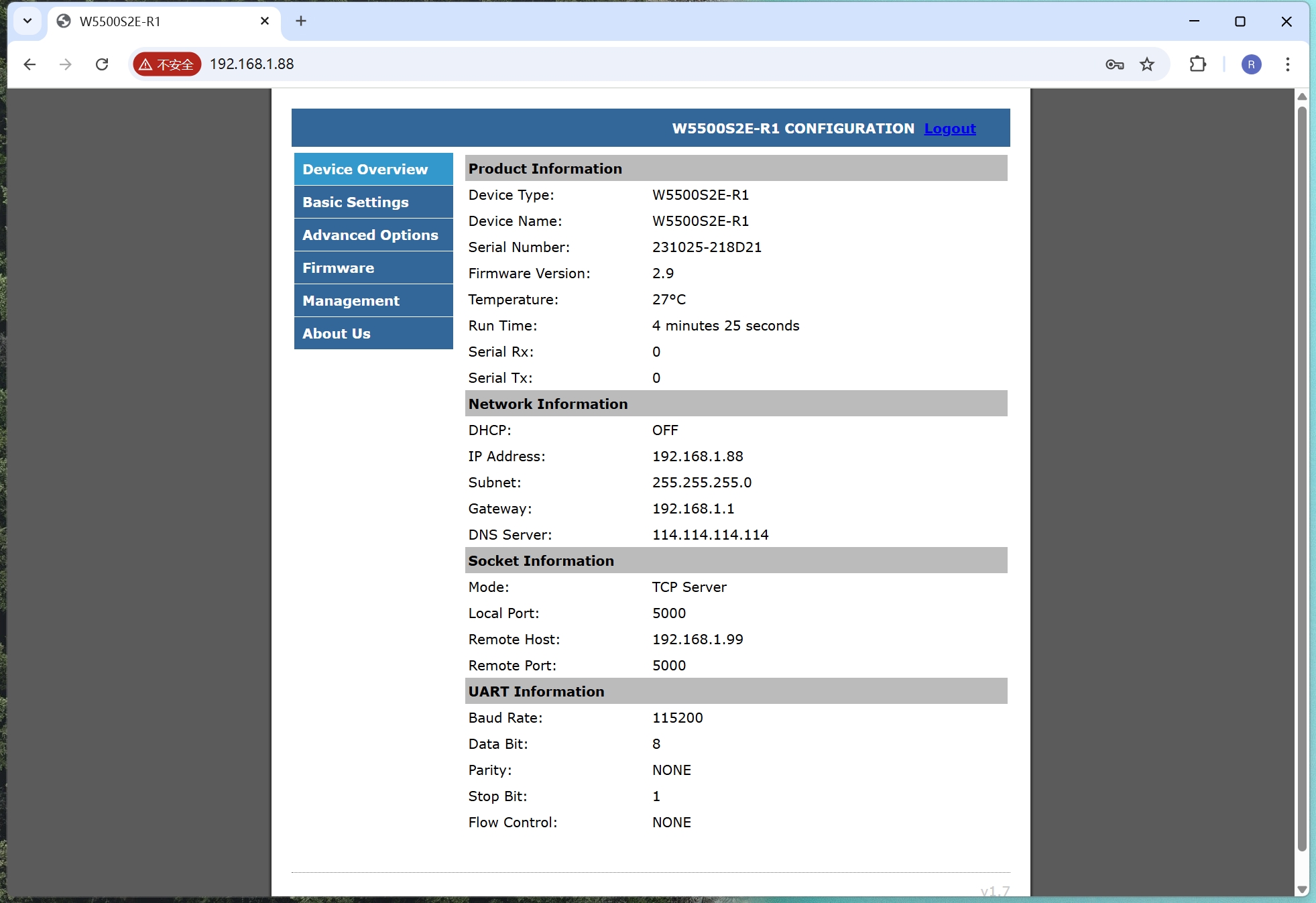 As shown in the figure below, it is the basic information page after logging in to the WIZ-IP75 configuration page. If you need to log out, click the "Logout" link in the upper right corner. This page provides an overview of the basic configuration information for WIZ-IP75 .