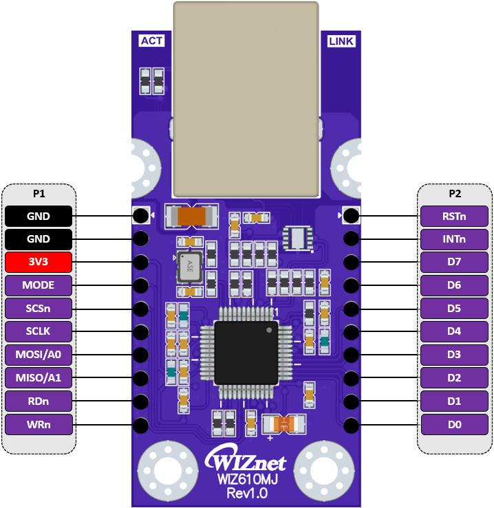 The WIZ610MJ is a compact Ethernet module that integrates the W6100 hardwired TCP/IP chip with an embedded PHY and an RJ45 MAG-JACK. It supports both IPv4 and IPv6 Dual Stack, enabling flexible networking for modern embedded systems. By combining all essential Ethernet hardware in one module, it eliminates complex PCB design for the transformer and RJ45 interface. The WIZ610MJ is ideal for developers who want to implement network-enabled systems quickly and reliably.