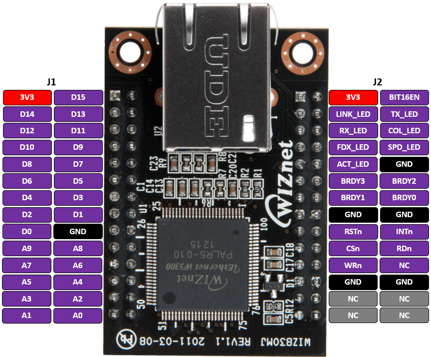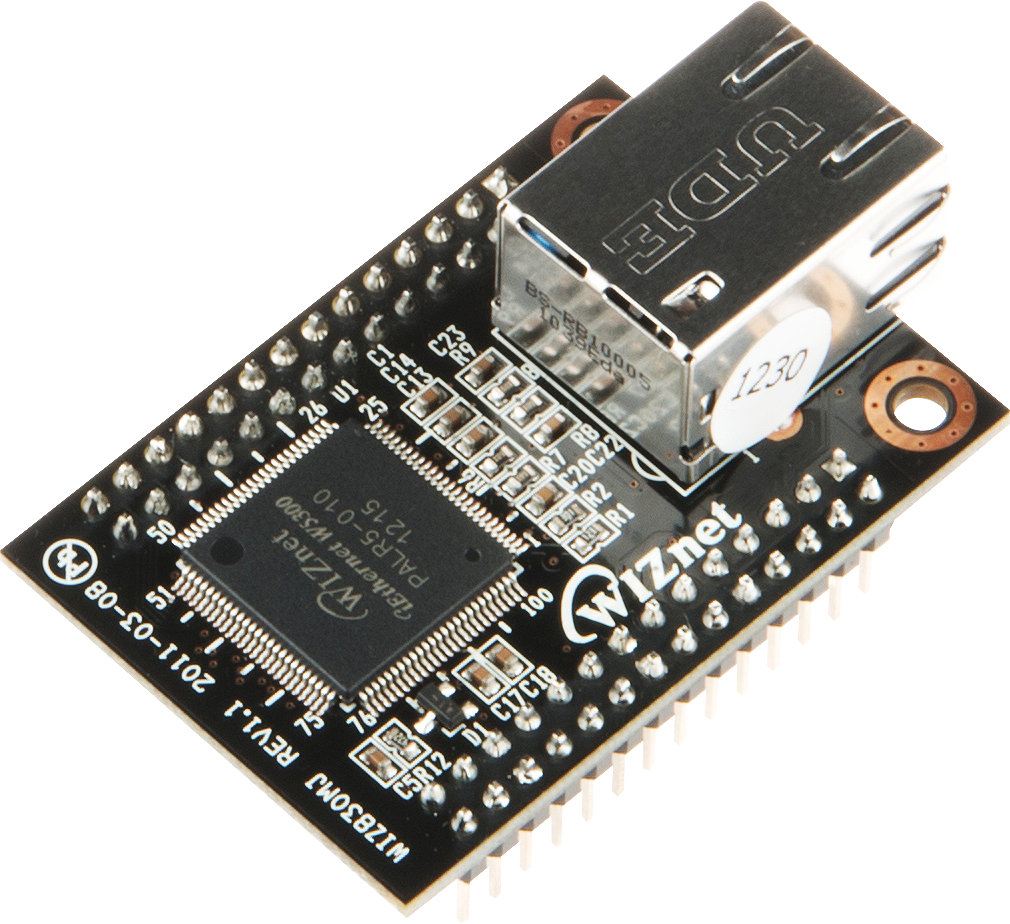 - Plug-in network module integrating W5300 hardwired TCP/IP chip, transformer, and RJ45 MAG-JACK