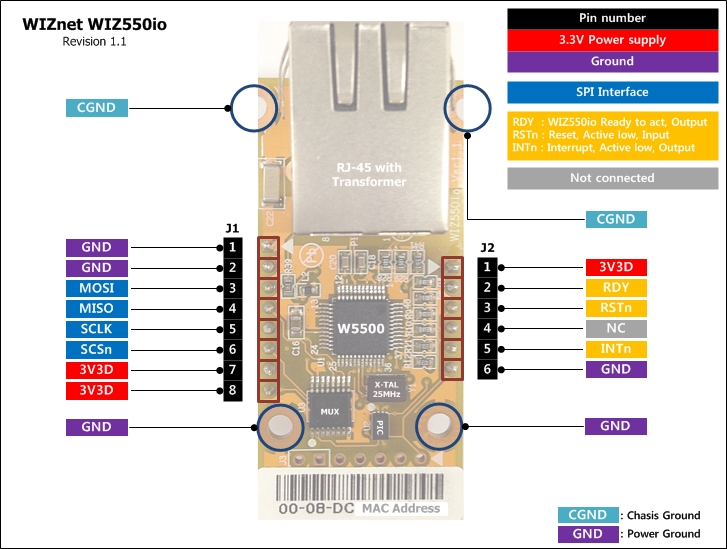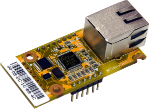 The WIZ550io is an auto-configurable Ethernet module integrating the W5500 hardwired TCP/IP chip with an embedded PHY, transformer, and RJ45 (MAGJACK). It automatically assigns network parameters using a pre-programmed MAC address, enabling instant network access upon power-up. Designed for easy and rapid Ethernet connectivity, it eliminates the need for manual MAC/IP configuration.